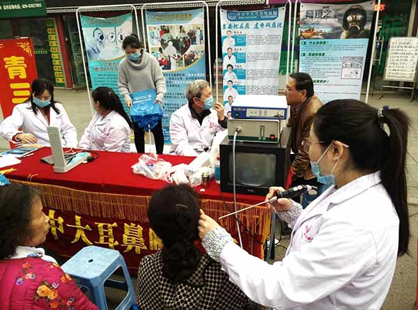 医护志愿者使用耳内窥镜为患者检查