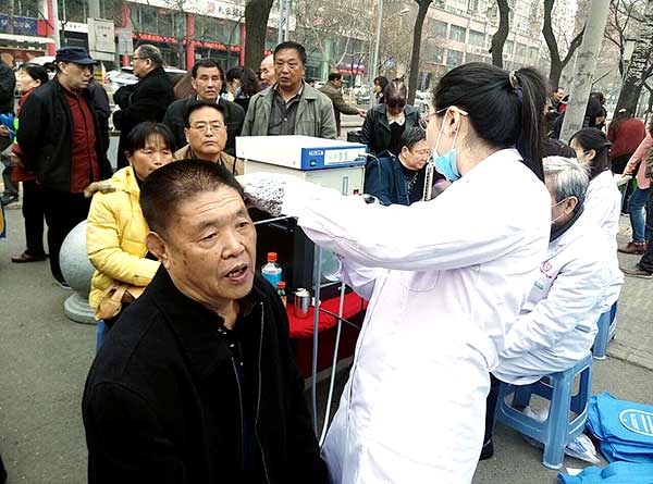 本次义诊医护志愿队伍由西安中大耳鼻喉医院内科医生孙连玉主任带领。早上9点,在莲湖区青年路街道莲湖公园,医护志愿队已经搭好了义诊台,开始为市民检查身体。很多市民马上聚拢过来,争相咨询病况。